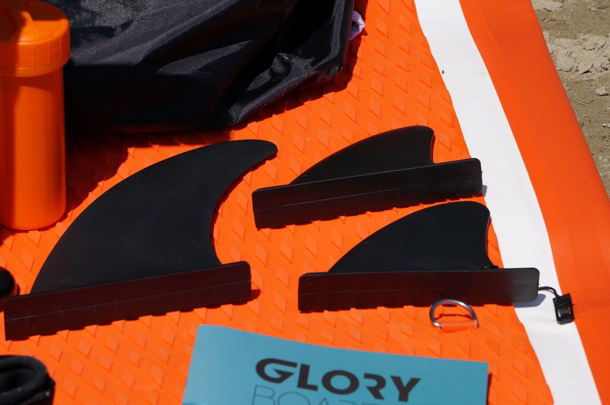 Das Glory Board arbeitet mit einem 3er Finnen-Setup mit Steckfinnen. Die mittlere Hauptfinne wird seitlich von zwei kleineren Finnen flankiert. Alle Finnen werden per Stecksystem schnell am Board befestigt.