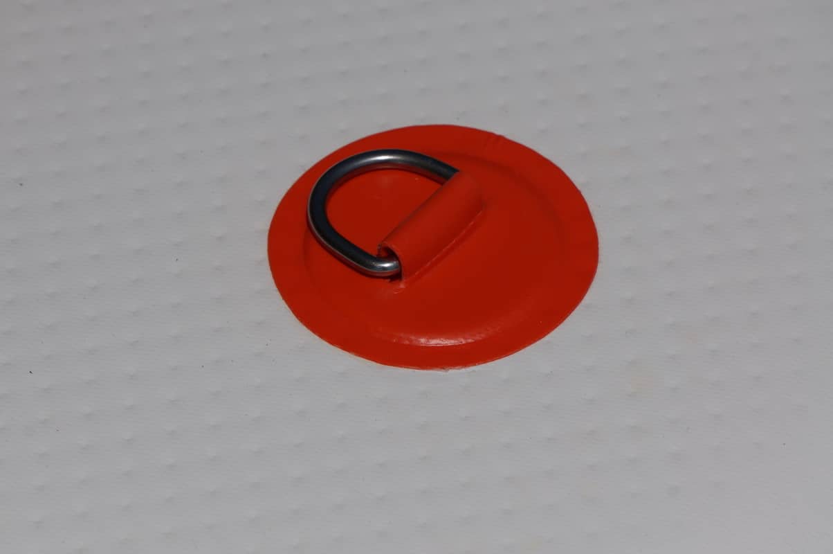 Zur Befestigung der Leash ist eine Metallöse hinten in der Mitte angebracht. Vier weitere Ösen befinden sich seitlich auf dem Deckpad. Diese Ösen sind zur Befestigung des optional erhältlichen Kanu Sitzes vorgesehen. Der Tragegriff ist mittig auf dem Board platziert.