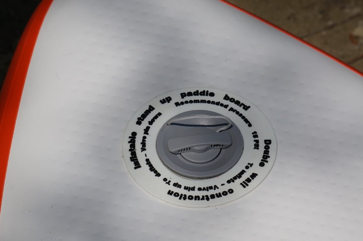 Mit der mitgelieferten Pumpe (inkl. Manometer) können wir das Board locker auf den angegebenen Soll Druck von 1 bar (15 PSI) bringen. Das Aufpumpen dauerte bei uns im Test ca. 7 Minuten – in unter 10 Minuten sollte es also für die Allermeisten zu schaffen sein. Der Soll Druck ist am Ventil des Boards angegeben. Auf dem Manometer der Pumpe selbst gibt es keine direkte Markierung hierzu.
